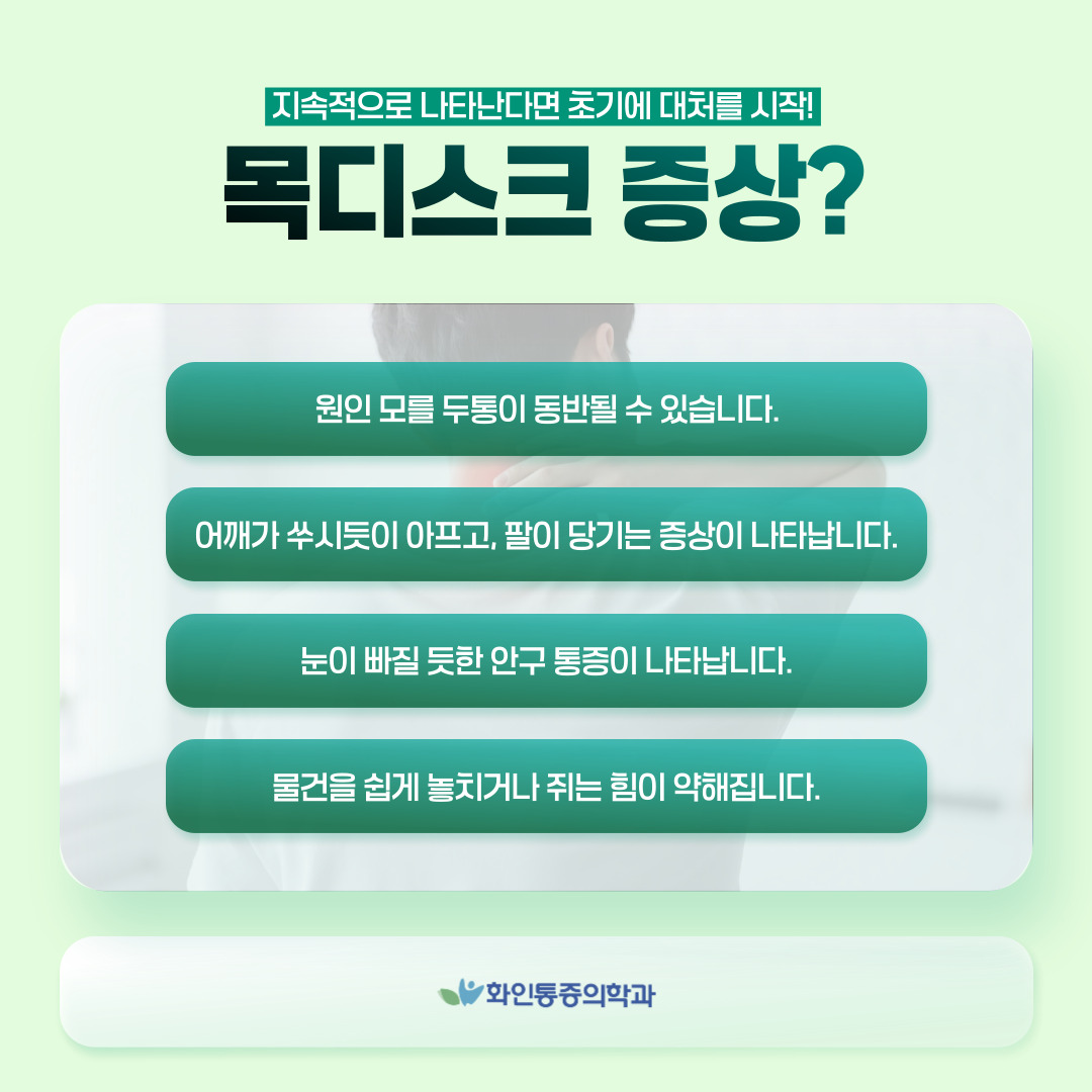 | ✅ 목 통증 및 뻣뻣함 초기에는 목이 잘 돌아가지 않거나 뻐근한 통증이 반복됩니다. |