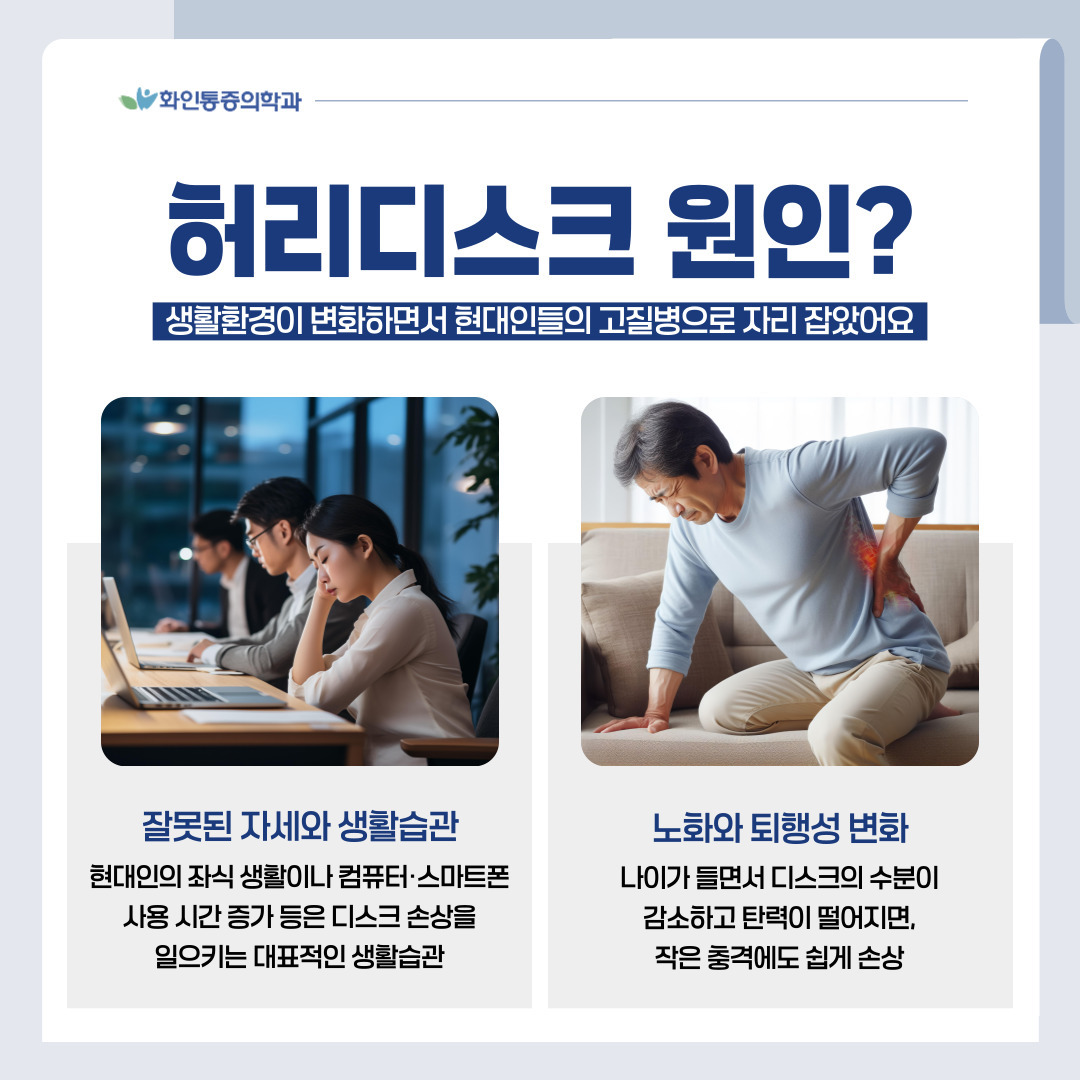 | ✅ 잘못된 자세와 생활습관 장시간 앉아 있거나, 무거운 물건을 무리하게 드는 행동, 또는 구부정한 자세로 오래 앉는 습관은 척추에 부담을 주어 허리디스크의 주요 원인이 됩니다. 특히 현대인의 좌식 생활이나 컴퓨터·스마트폰 사용 시간 증가 등은 디스크 손상을 일으키는 대표적인 생활습관입니다. |