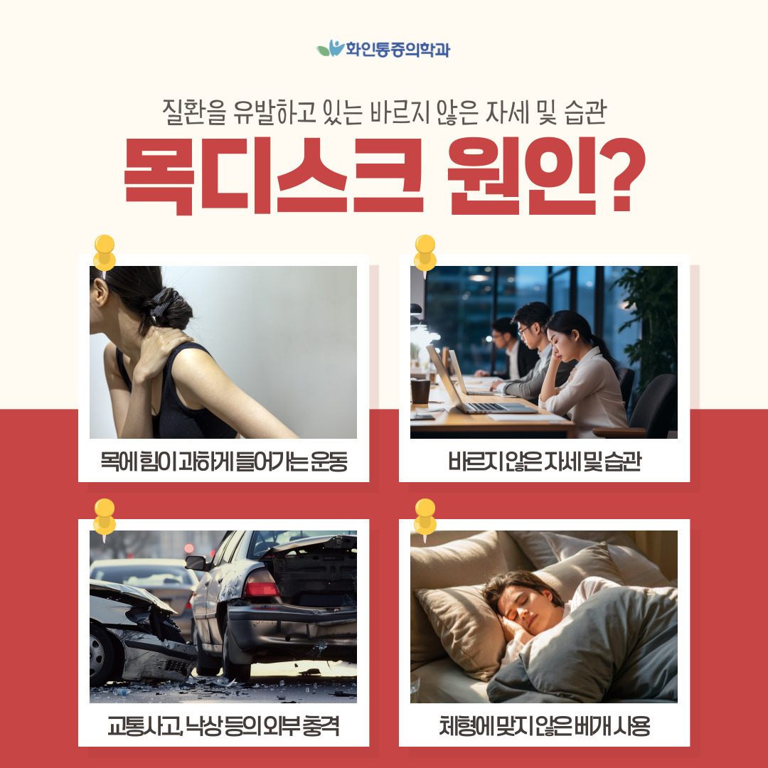 | 4. 반복적인 움직임 특정 직업이나 운동으로 인해 목을 반복적으로 사용하는 경우, 추간판에 지속적인 스트레스가 가해져 손상이 발생할 수 있습니다. |