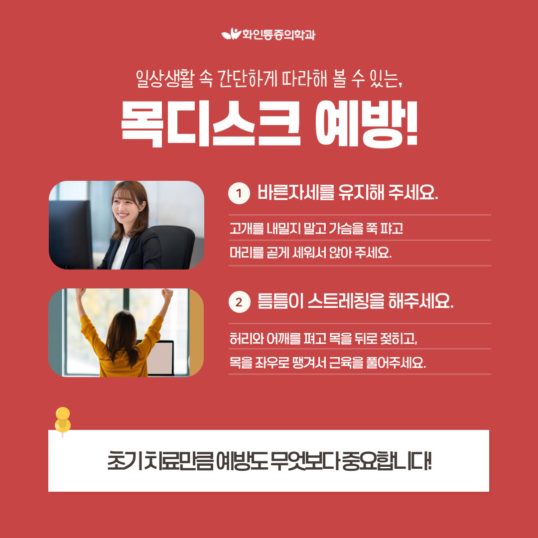 | ✅ 규칙적인 스트레칭과 운동 목 주변 근육을 강화하면 추간판에 가해지는 부담을 줄일 수 있습니다. 무리한 운동보다는 가벼운 스트레칭, 어깨 돌리기, 바른 자세로 걷기 등이 좋은 습관이 될 수 있습니다. |