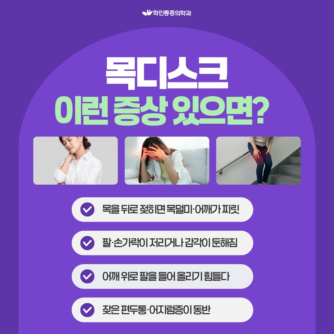 가벼운 근육통과 달리 목디스크는 다음과 같은 특징적인 신호를 보입니다.