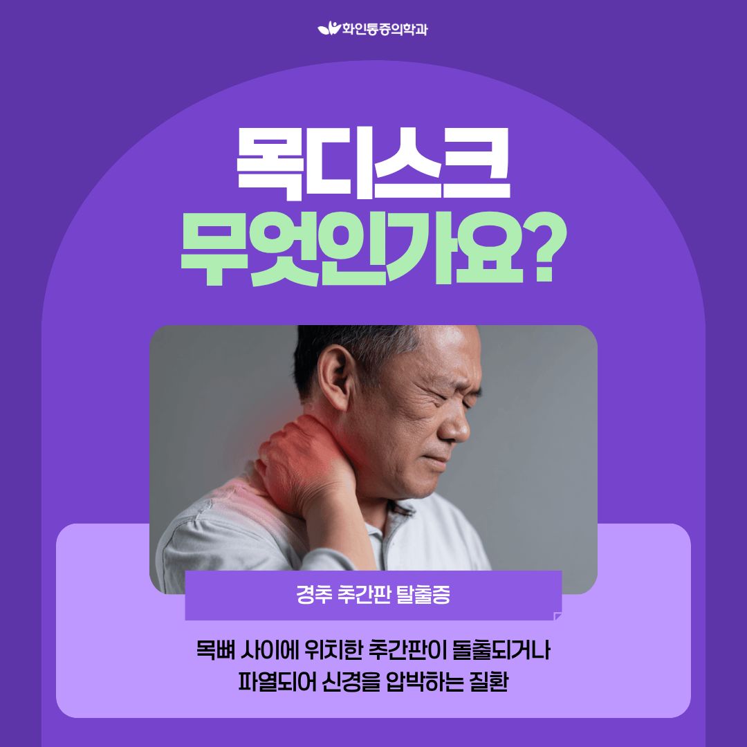 목디스크(경추 추간판 탈출증)는 추간판이 제자리에서 벗어나거나 변성이 진행되면서 주변 신경을 자극하는 상태를 말합니다.